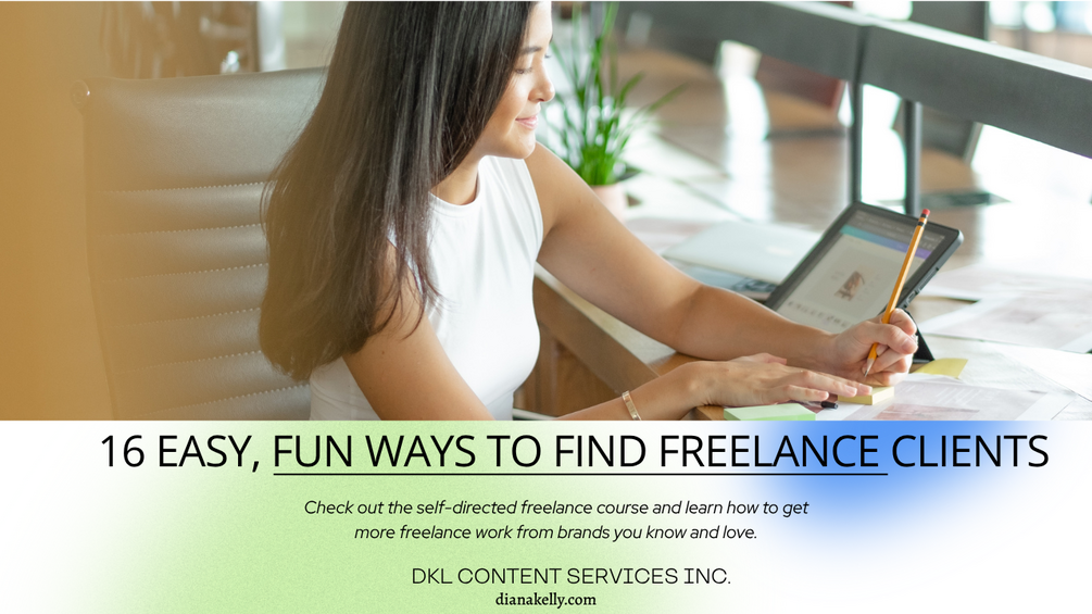 Veteran freelance writer and freelance writing coach Diana Kelly Levey created this <25-minute presentation of "16 Fresh Ways to Find Freelance Brand Clients" based on the daily and weekly freelance marketing exercises she does to keep content marketing clients and copywriting clients coming in. These fun exercises are so easy to complete and will help you "get out of your head" and feel overwhelmed by the competition on fiverr, upwork, and freelancer type platforms.